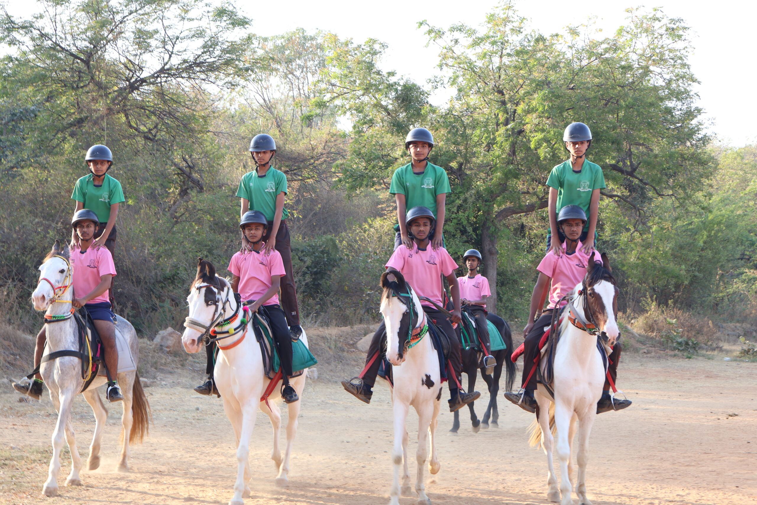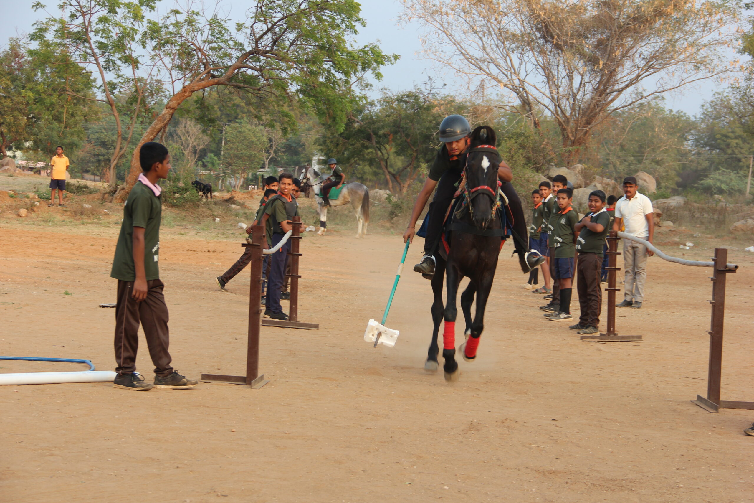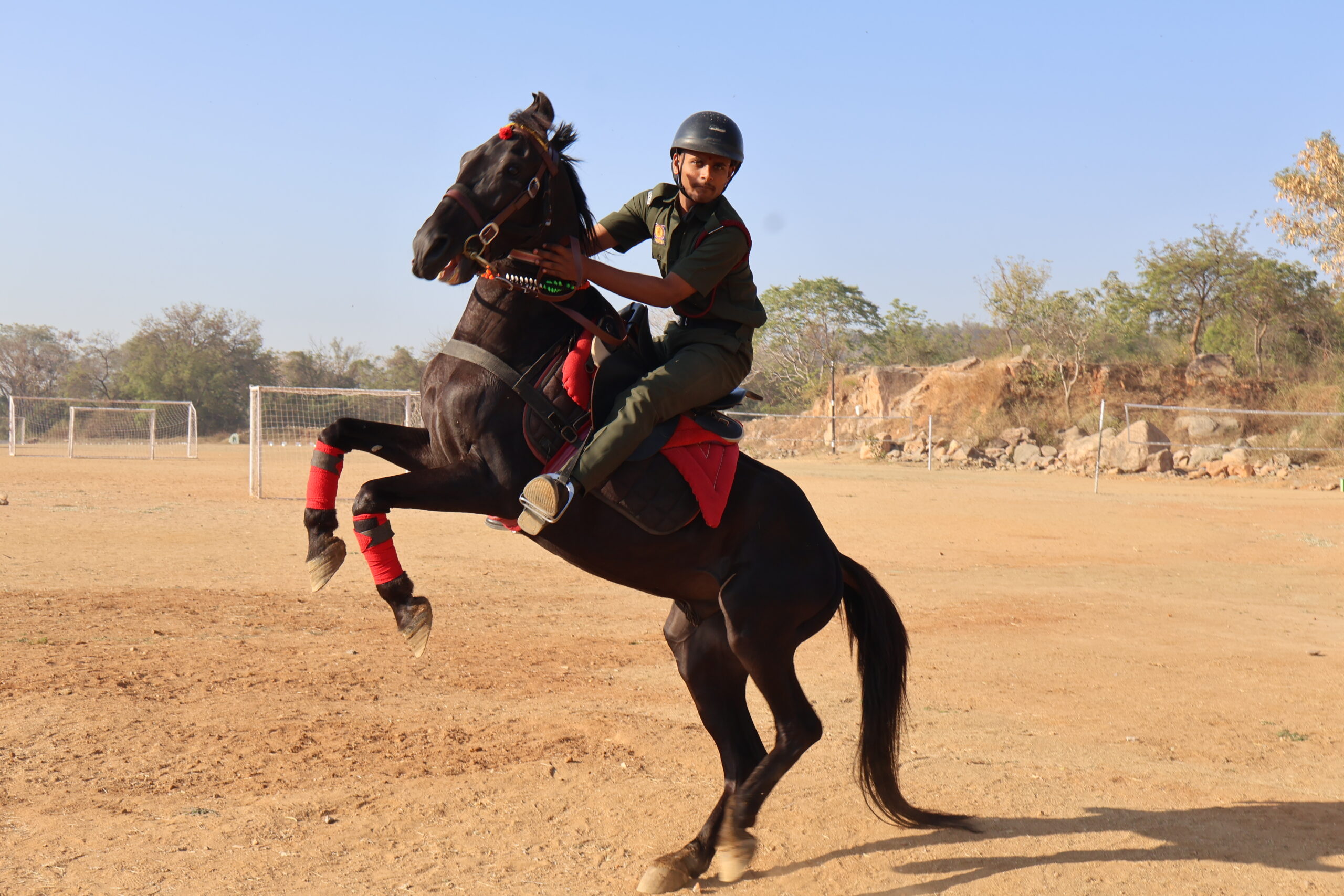 Being an indispensable part of Military Training Riding coach and supportive staff have been appointed here in our Sainiki Vidyalaya. There are seven horses in the stable. Cadets have been trained in different skills from walk-trot-canter-gallop to show jumping and many others. They have been trained under the supervision of senior cadets. Senior cadets are deliberately involved in maintenance of the stable to teach them responsibility. They have been provided with all essentials like helmet, grooming kit, saddle, boots, gloves and first aid kits to avoid physical injuries. The stable is safe, hygienic, and animal-friendly and supports learning activities. Stable is regularly disinfected. Stalls and the feed room are independent blocks. Arena and pastures have been very well maintained.