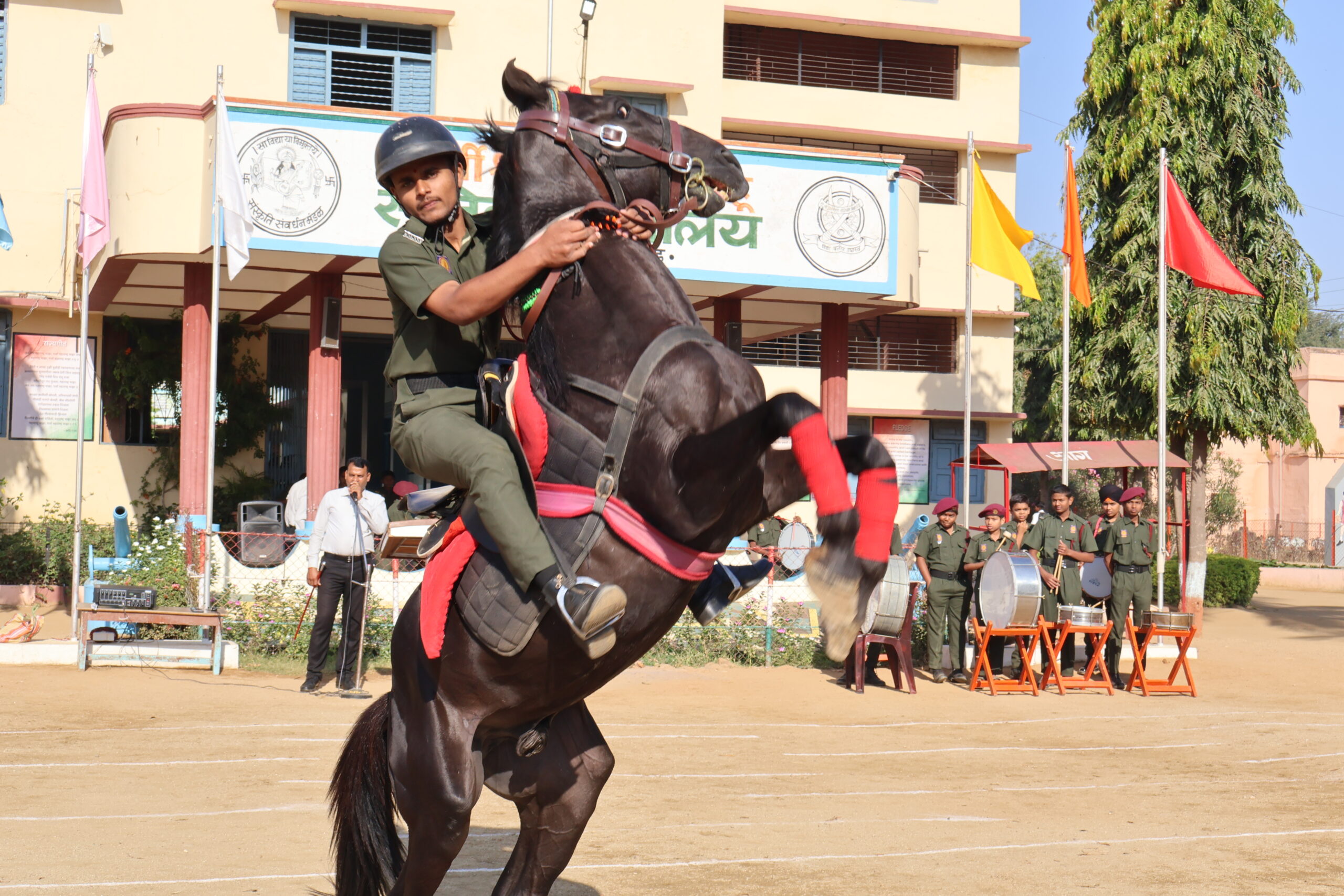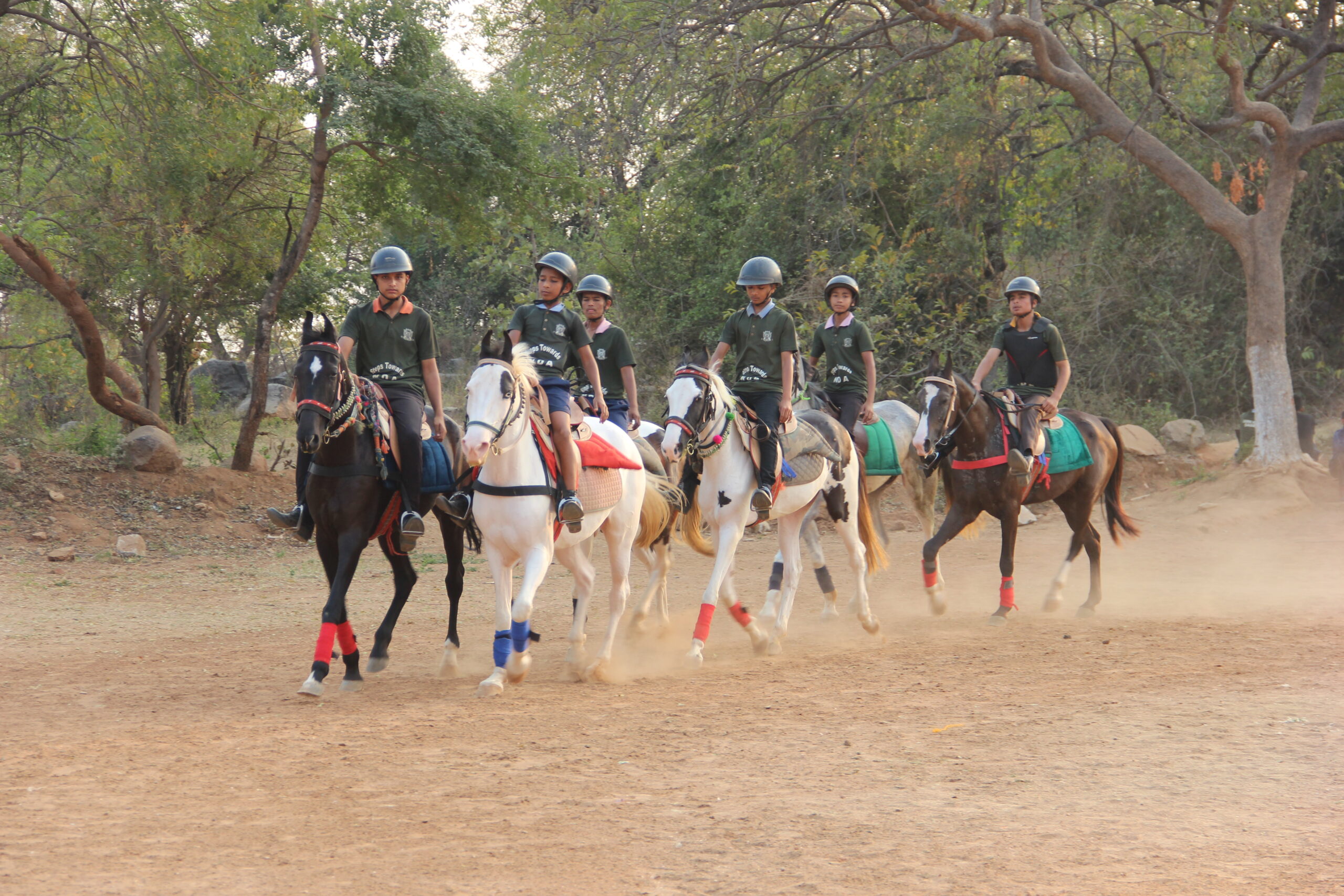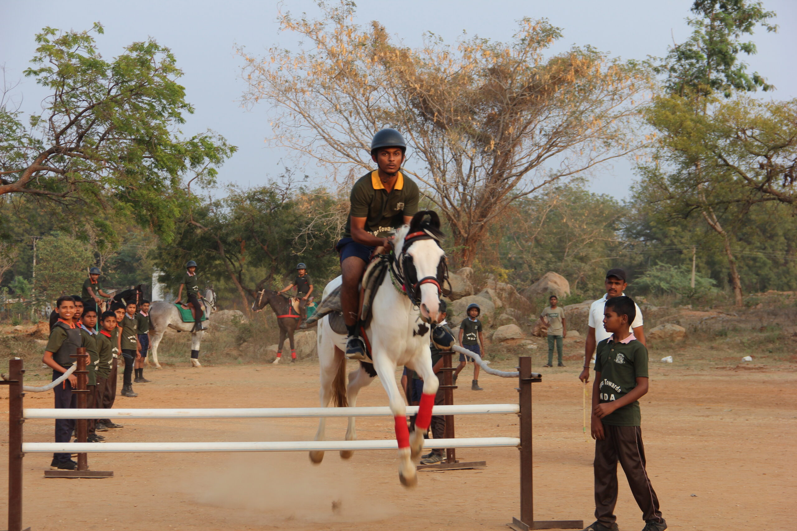 Being an indispensable part of Military Training Riding coach and supportive staff have been appointed here in our Sainiki Vidyalaya. There are seven horses in the stable. Cadets have been trained in different skills from walk-trot-canter-gallop to show jumping and many others. They have been trained under the supervision of senior cadets. Senior cadets are deliberately involved in maintenance of the stable to teach them responsibility. They have been provided with all essentials like helmet, grooming kit, saddle, boots, gloves and first aid kits to avoid physical injuries. The stable is safe, hygienic, and animal-friendly and supports learning activities. Stable is regularly disinfected. Stalls and the feed room are independent blocks. Arena and pastures have been very well maintained.