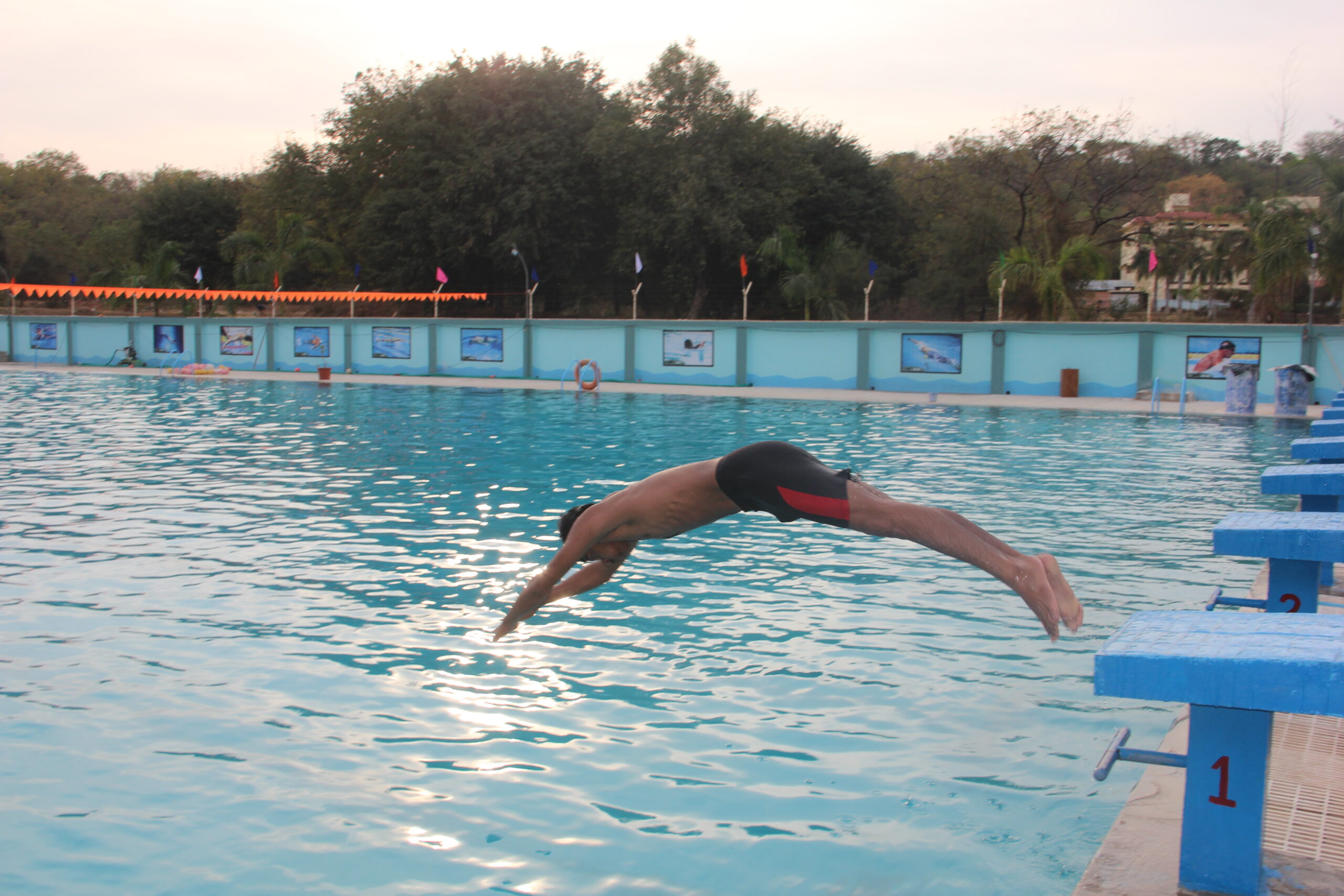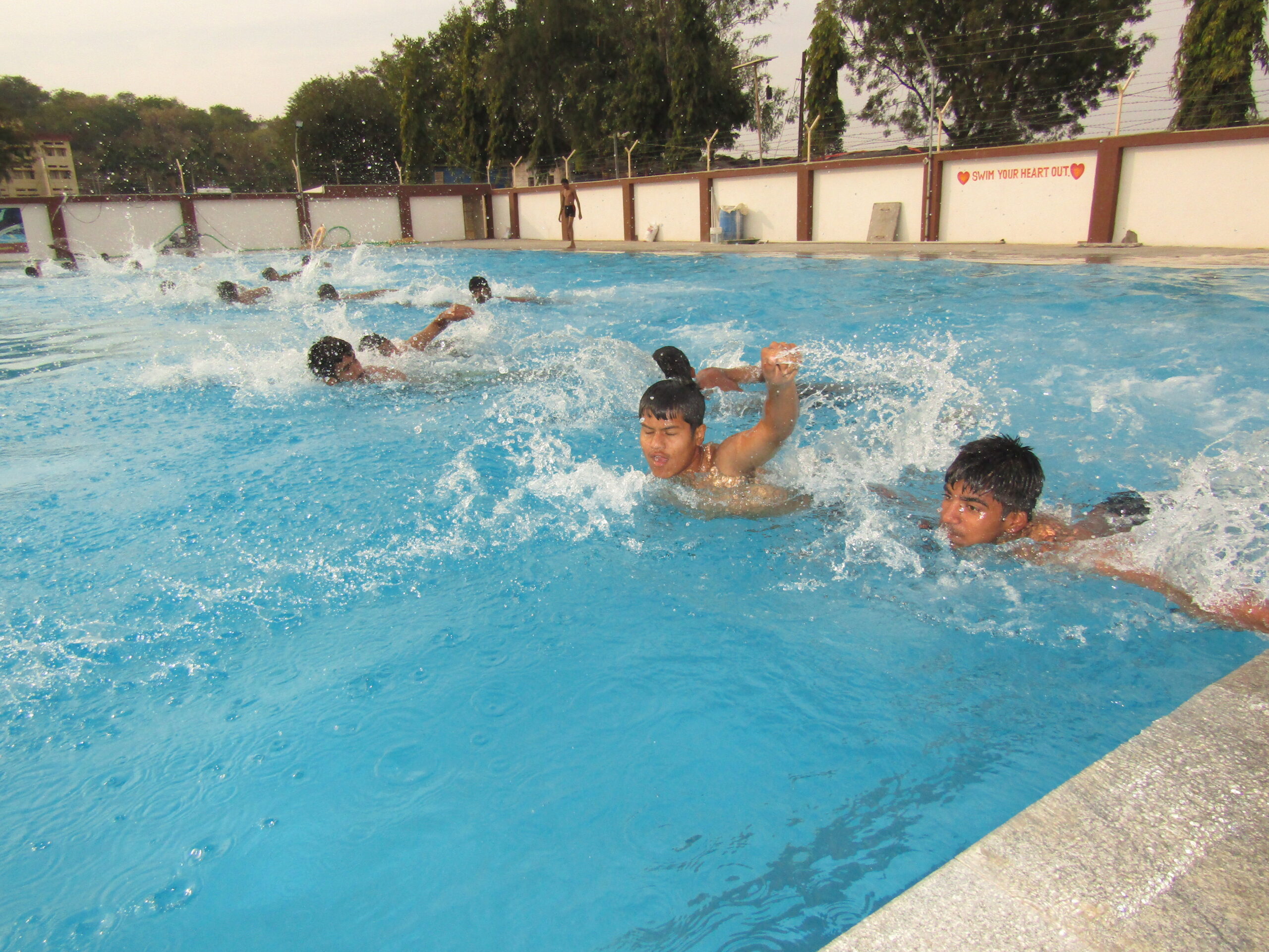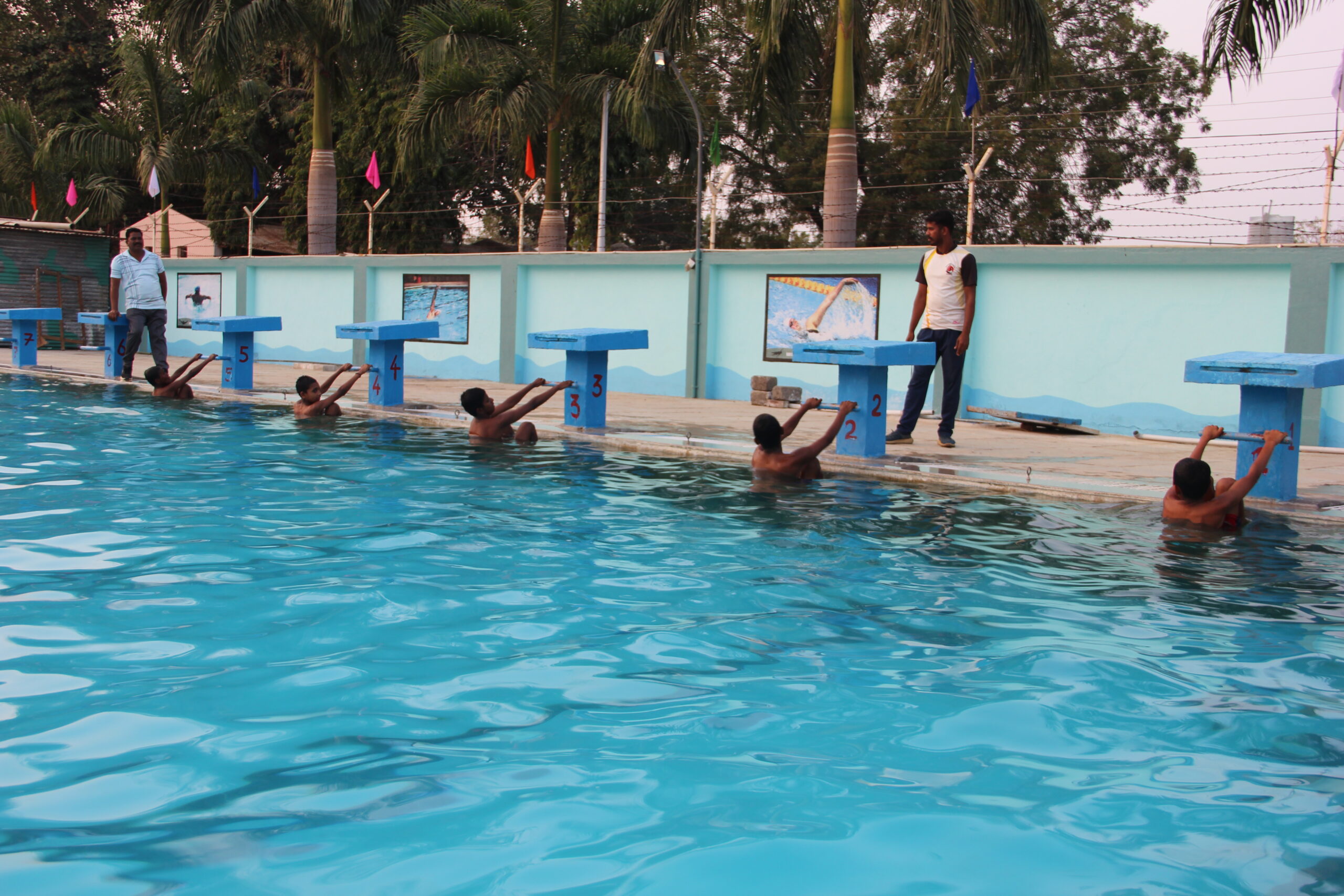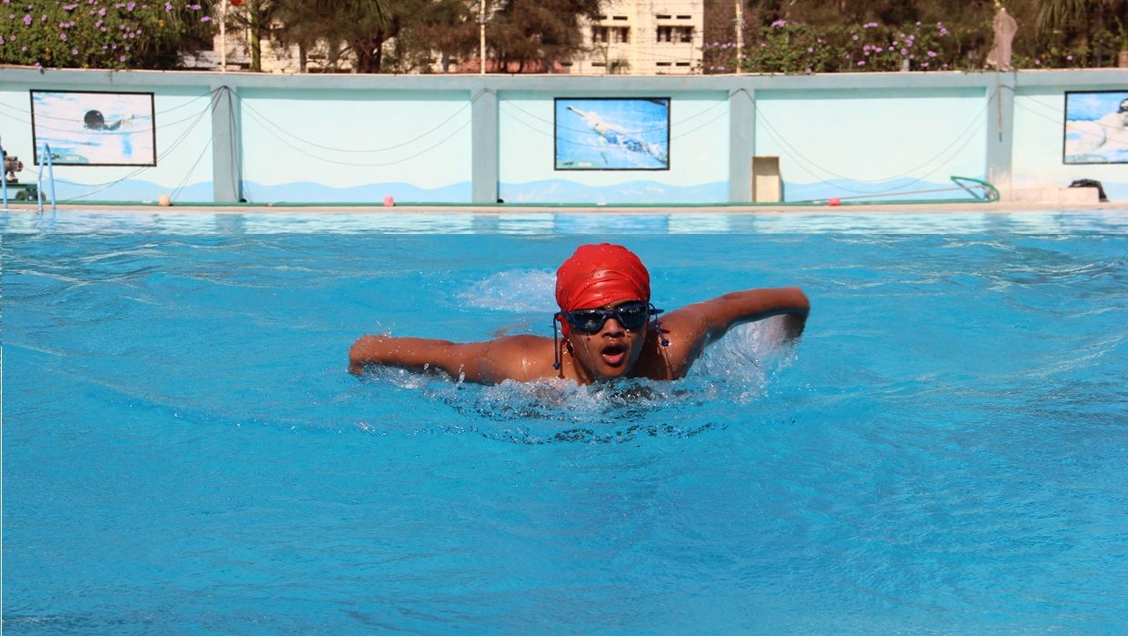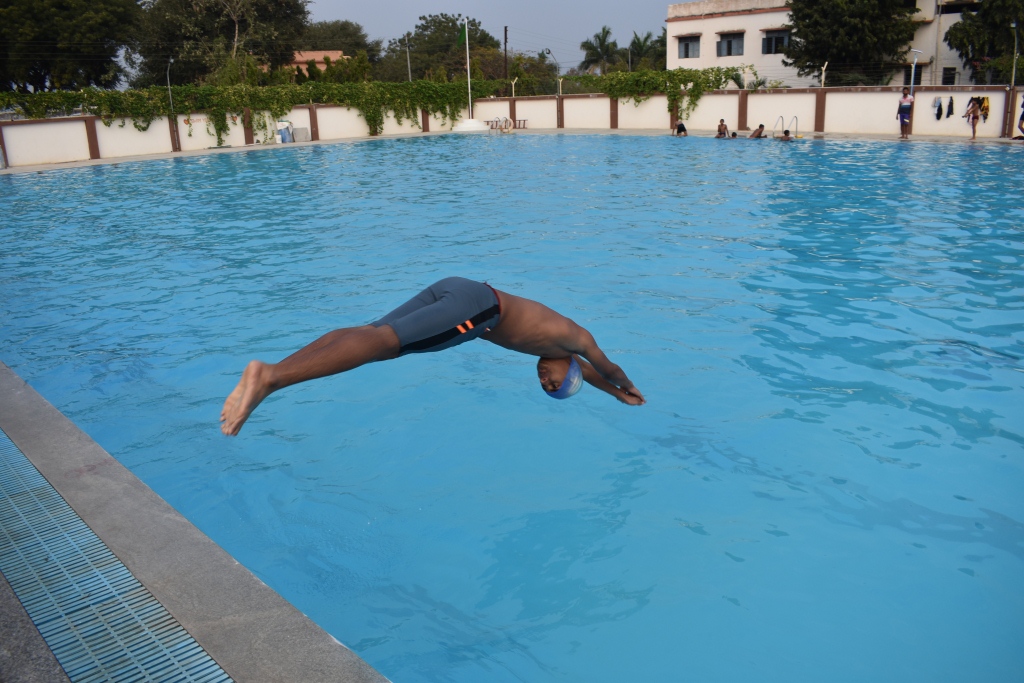 An Olympic size rectangular swimming pool (50 M*25M) is situated on the western side of the school building. Its depth is nine feet and has nine swimmer lanes. Three sand filters have been installed underground to ensure constant filtration and chlorination is done at certain intervals. Three coaches with two lifeguards ensure the safety and standards. Railings are available for easy entry and exit. Tall compound wall around it prevents unwanted happenings.