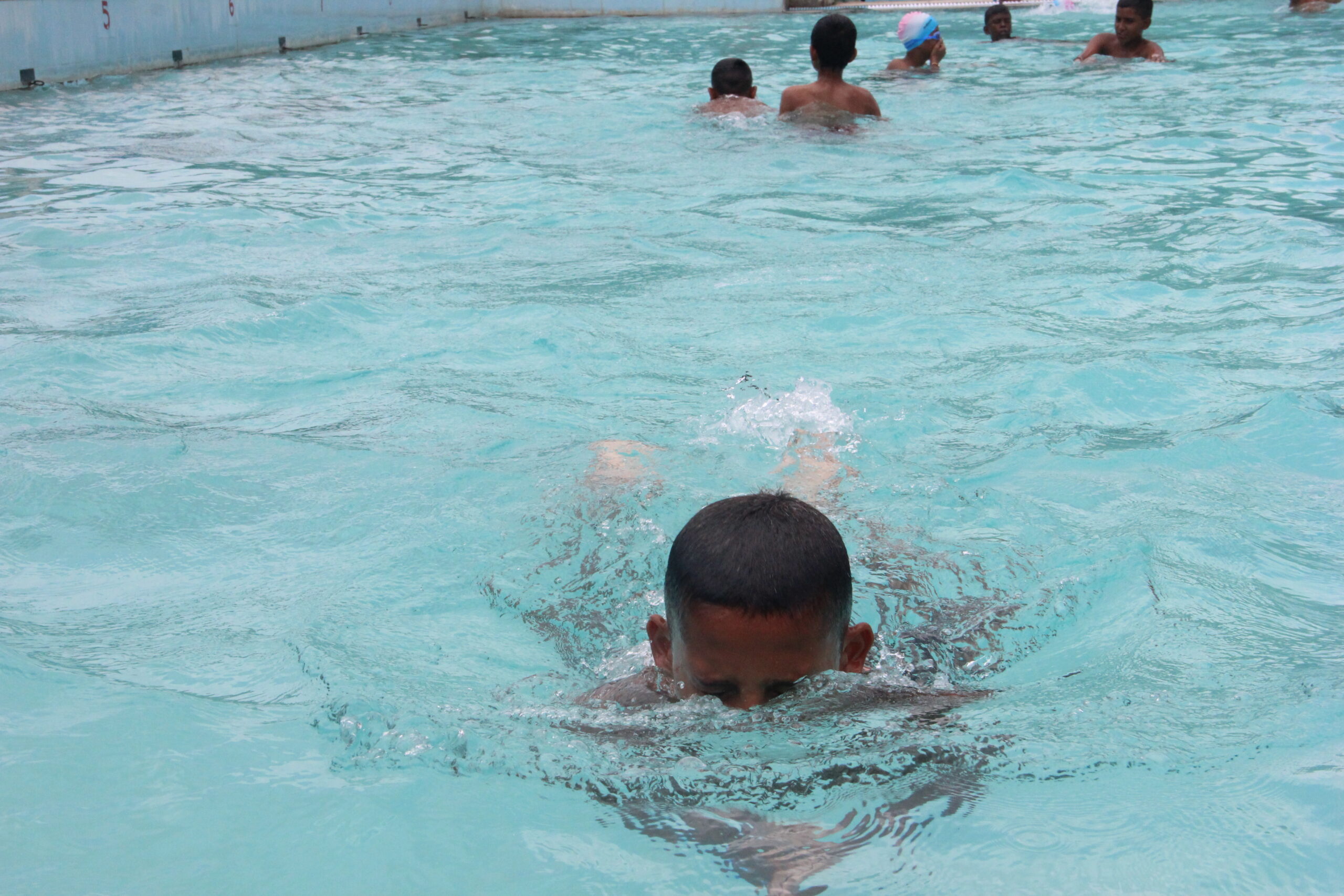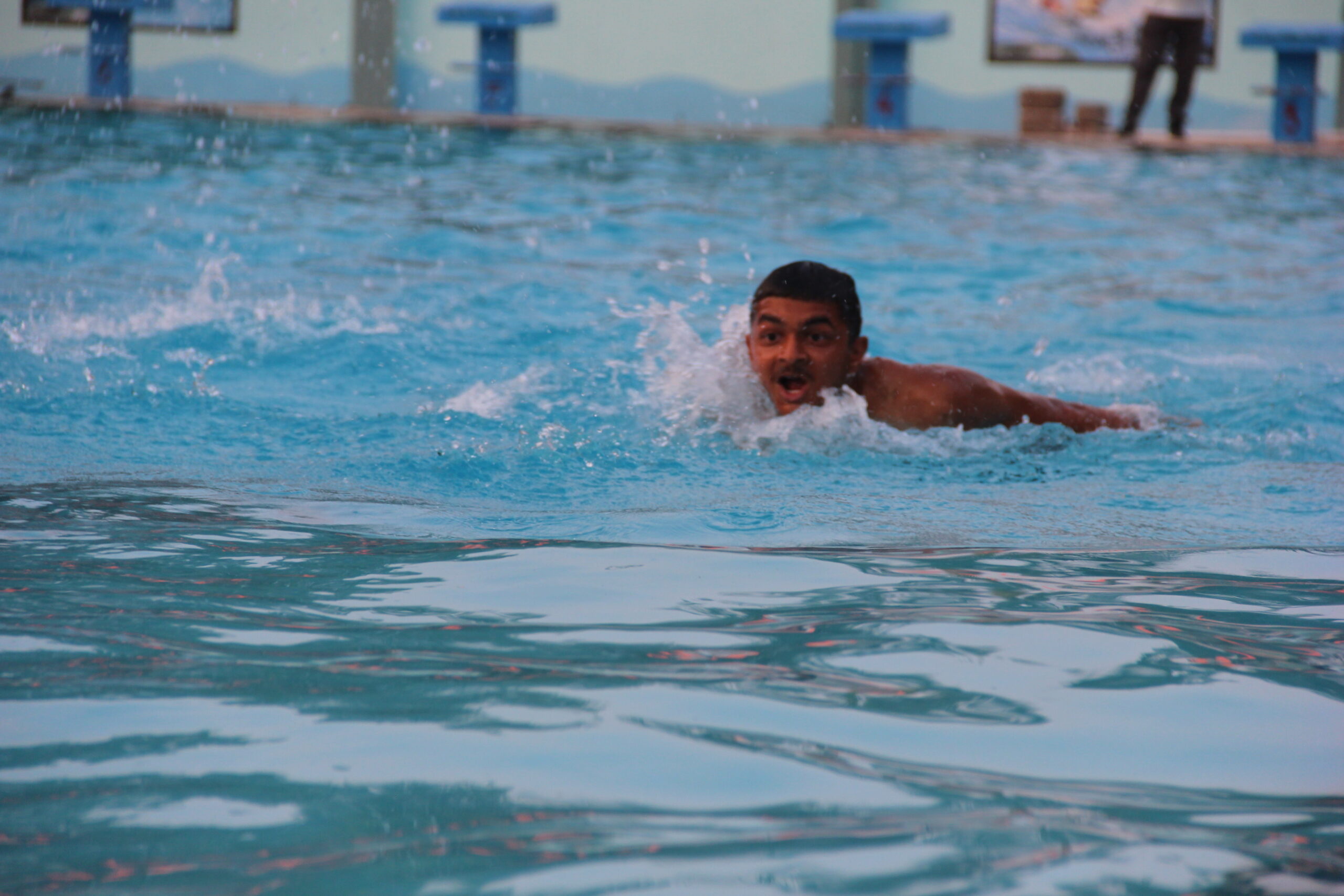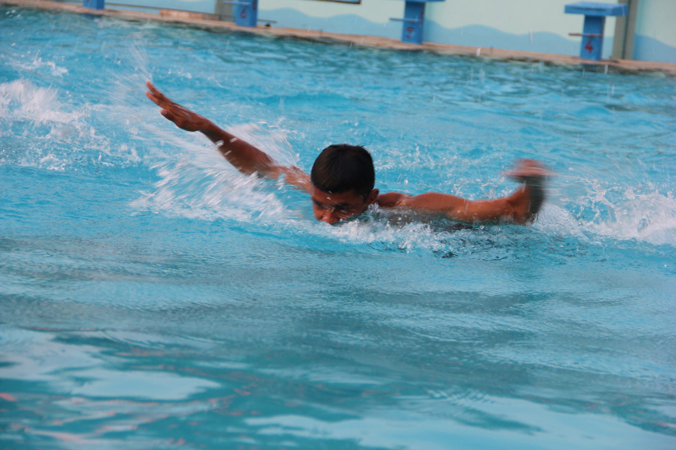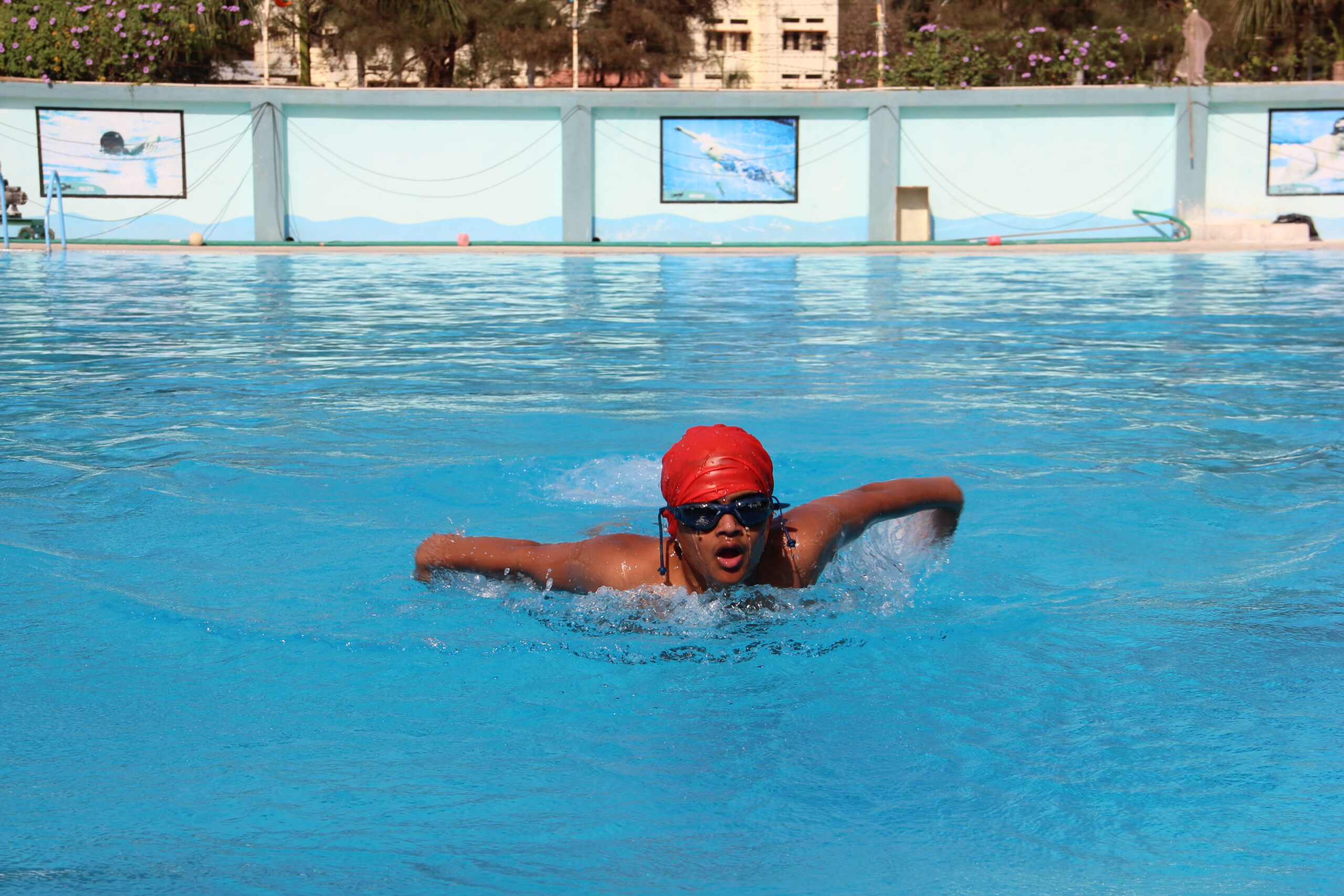 An Olympic size rectangular swimming pool (50 M*25M) is situated on the western side of the school building. Its depth is nine feet and has nine swimmer lanes. Three sand filters have been installed underground to ensure constant filtration and chlorination is done at certain intervals. Three coaches with two lifeguards ensure the safety and standards. Railings are available for easy entry and exit. Tall compound wall around it prevents unwanted happenings.